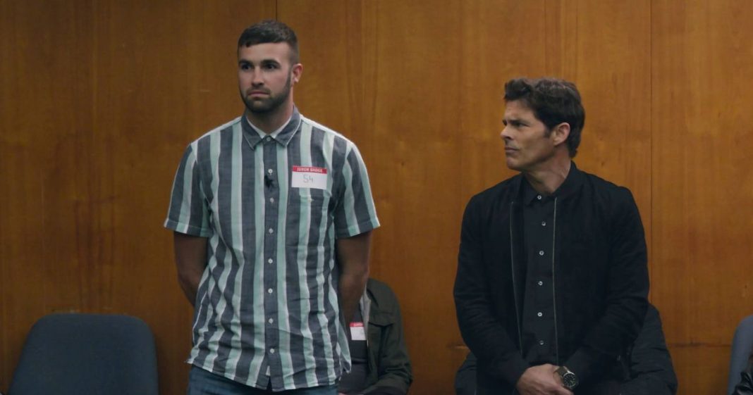 James Marsden stars as a fake juror, playing an exaggerated, satirical version of himself, alongside a cast of actors portraying fellow jurors, including one who continuously nods off during proceedings.