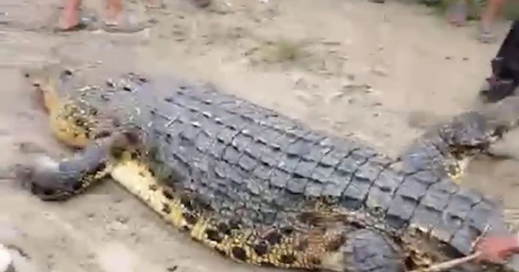 As residents crowded around the murky Luan Boya River, the croc emerged and paraded the woman’s dismembered corpse around. Shocking footage shows the predator drifting toward the surface carrying woman’s lifeless body in its jaws.
