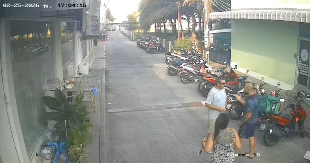 The footage allegedly shows Alan backing away as the suspect brushes aside his Thai girlfriend.
